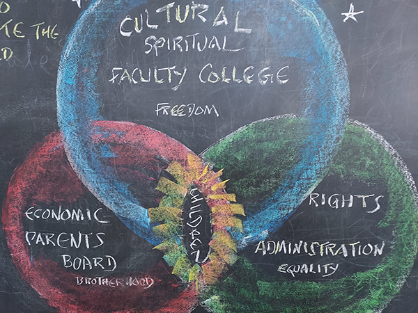 As a Waldorf school, we work through a unique, collaborative model rather than a top-down hierarchy. Our Faculty, Administration, and Board each carry essential responsibilities and work together to serve the children. This approach reflects Rudolf Steiner’s idea that a healthy community has three realms: cultural, legal, and economic that need to stay in balance. In our school, the Faculty leads the cultural life through teaching and creativity, the Board ensures fairness and accountability, and the Administration supports both through coordination and care.